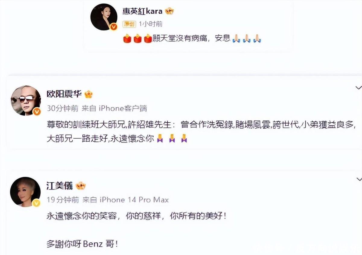 周润发、苗侨伟、佘诗曼、黄宗泽、吴卓羲、林峰等。大半个娱乐圈的著名艺人都对他含有很深的感情,过去探望,不舍悼念。虽然他的名气不如这些艺人大,但是不代表他的实力没有这些艺人强,贡献没有这些艺人大。