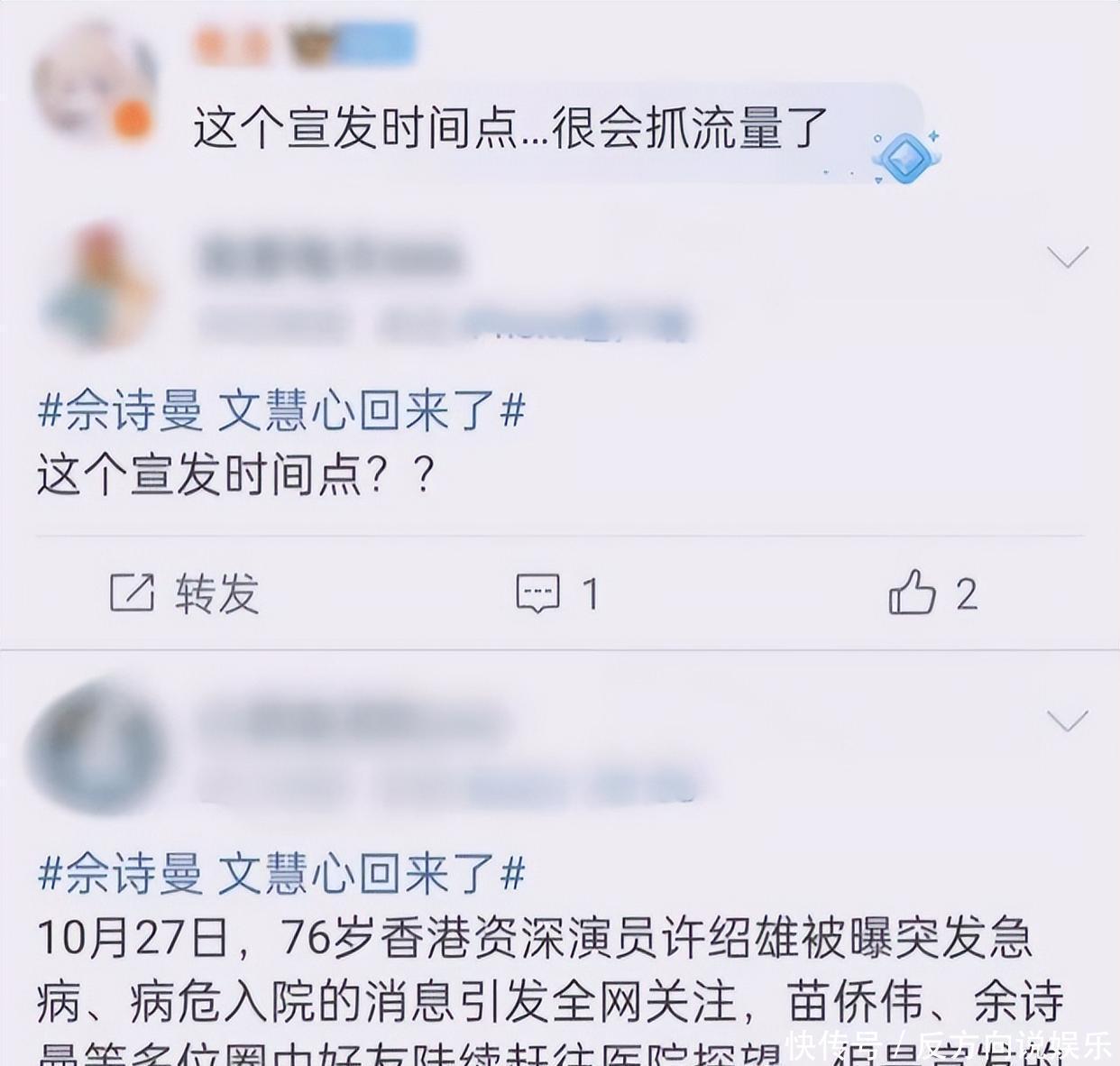 因为她的账号宣传新剧的时间,刚好是许绍雄去世的时间。很多人就觉得她想蹭许绍雄去世的热度,竟然在许绍雄去世的时间宣传新剧,有些冷漠无情,利益至上。